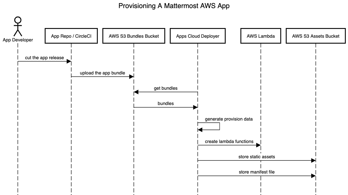 In order to be deployed in Mattermost Cloud, an app bundle is uploaded to the specific S3 bucket. On a new app release, a bundle is created by GitLab CI and uploaded to S3. The Mattermost apps cloud deployer, running as a k8s cron job every hour, detects the S3 upload, and creates appropriate lambda functions, assets, and manifest the same way the appsclt does for the third-party accounts.