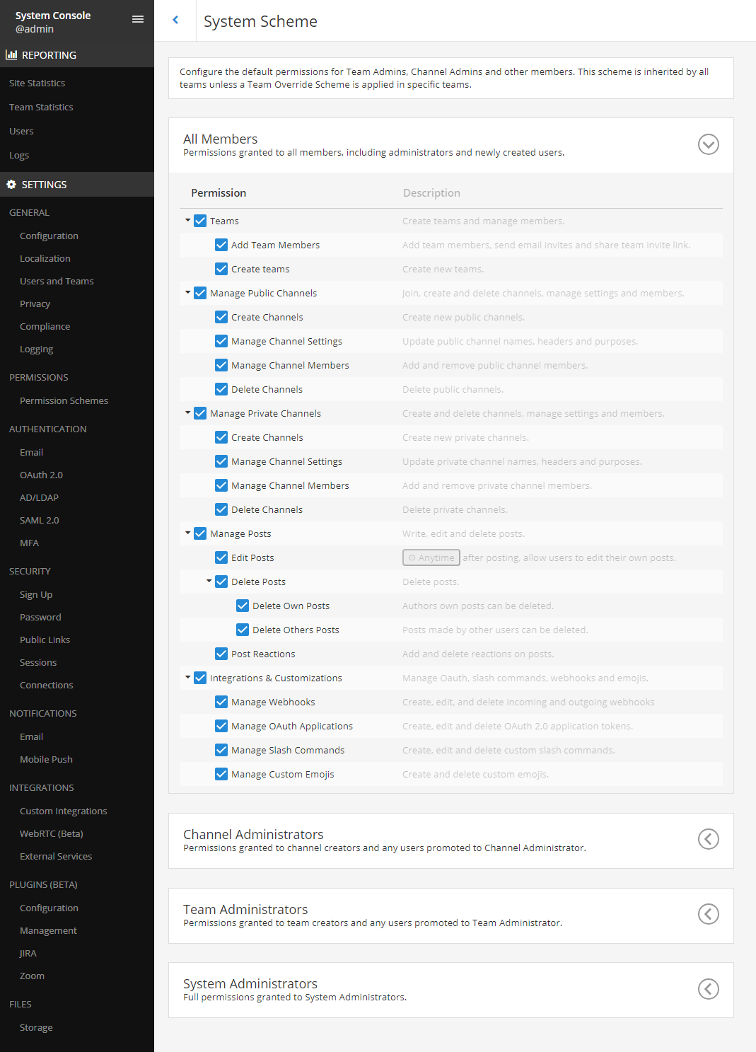 The Mattermost System Console provides a number of elements for Admins to control the permissions in their system.