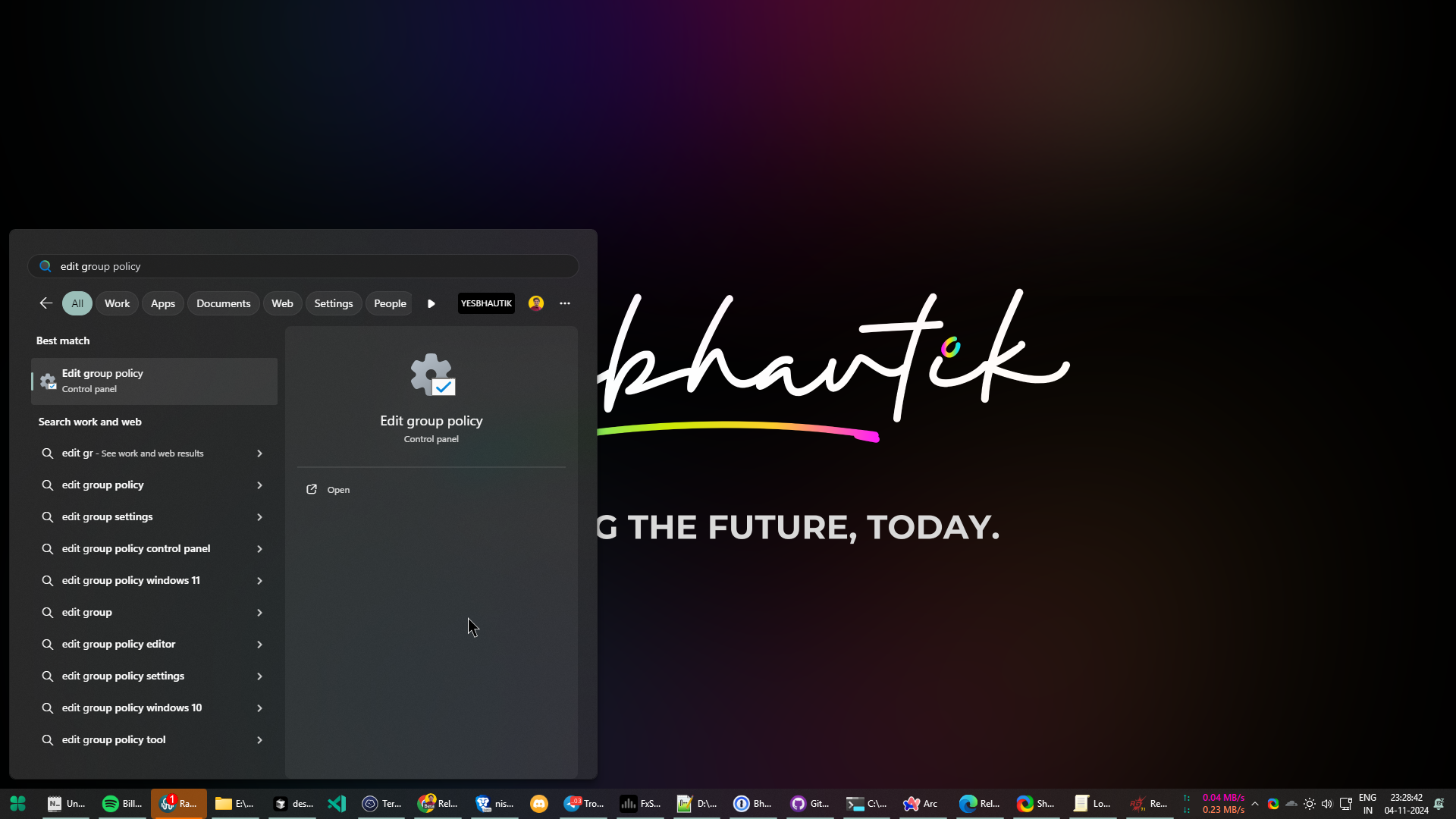 Edit group policyapplication by selecting Start, typinggpeditinto the search field, then selecting the resulting Edit group policy search option.