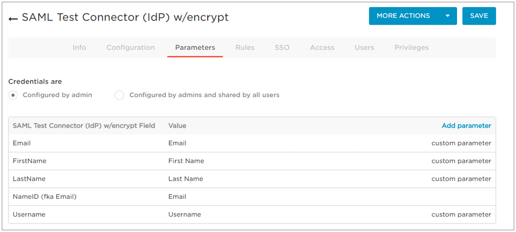 In OneLogin, select the Parameters tab, then select Add parameter. Map attribute parameters between OneLogin and Mattermost. Email attributes are required.