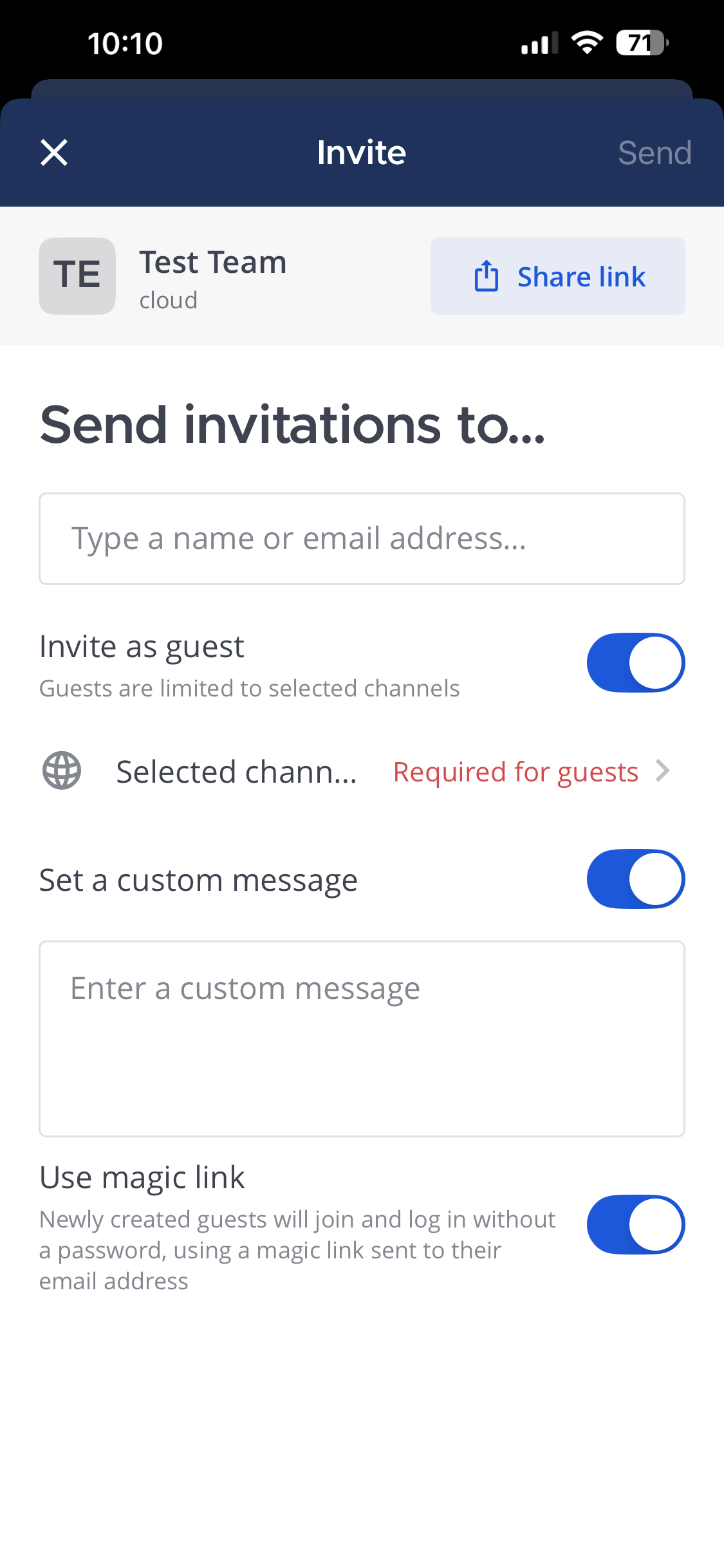 Invite as guest: Invite a guest temporarily with limited workspace access. See the guest accounts documentation to learn more about guest accounts. Specify their email address, select the channels they can access, and optionally add a custom message. Tap Send when ready.
